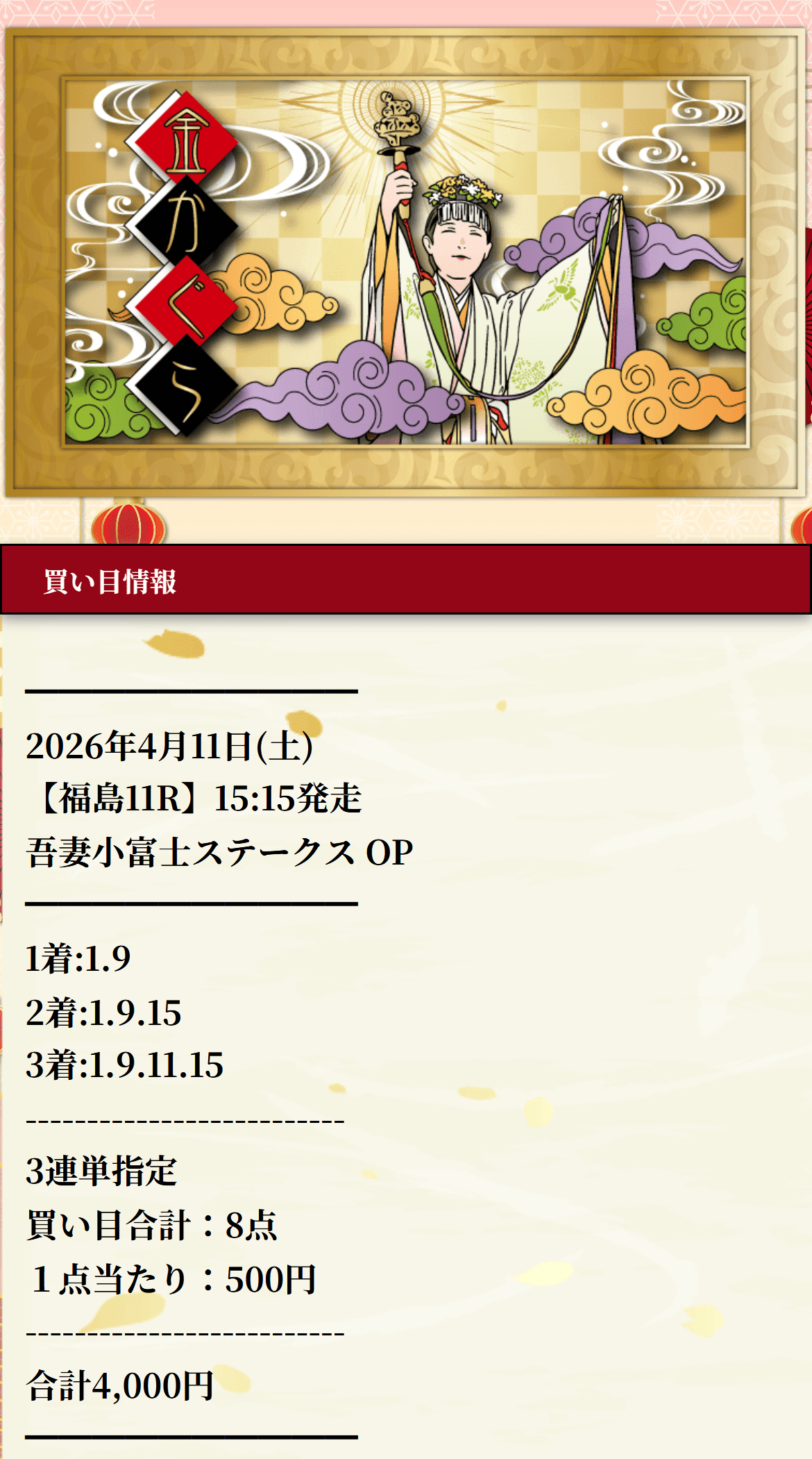 暁の重賞数え歌は、その吾妻小富士ステークスで5番人気のラタフォレストを頭に置いて、さらに2着8番人気、3着4番人気まで拾っているのがうまかったです。三連単は982.0倍、配当額は49万1000円。重賞やOPって、みんな注目するぶん逆に無難な組み方に流れやすいのに、この買い目はちゃんと配当を作る側の組み方になってた。読んでる側も「ああ、あの吾妻小富士Sか」ってなるし、そのうえでこの取り方なら印象に残ります。