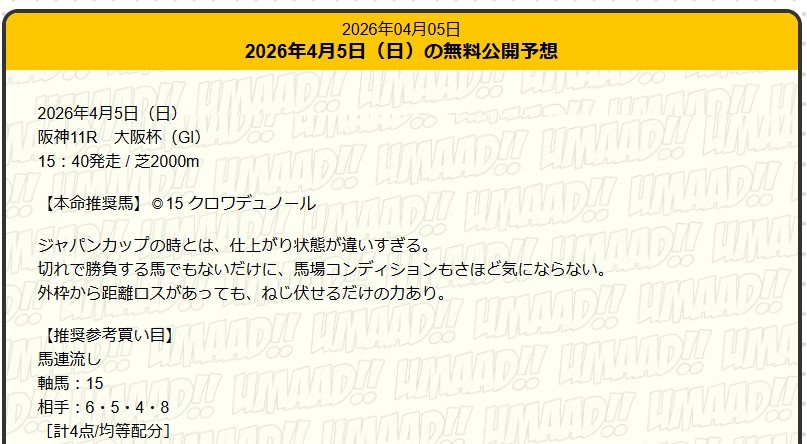 クロワデュノールを軸にして、相手を広げすぎずにちゃんと当てたのが好印象でした。ほかの無料予想が今回のG1大阪杯「当たってもガミ」だらけだったのに、うまあどは少点数のまましっかりプラス。
