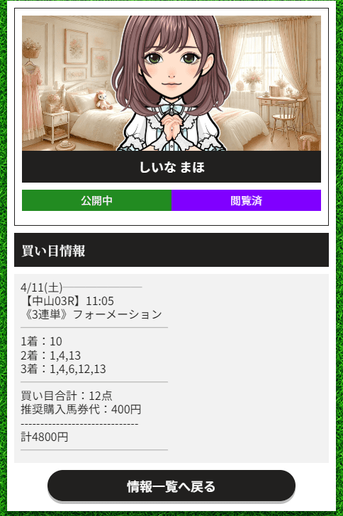 派手に二桁人気を振り回したわけじゃないのに、10番を頭で固定して、最後に6番人気の13番までちゃんと残しているから、配当がきれいに伸びてるんですよね。実際、決まったのは10→4→13で、3連単は21,980円。400円で入っていた分まで考えると、受け取れたのは87,920円でした。2番人気を頭にして、相手は3番人気だけじゃ終わらせない。この“ちょっとズラすうまさ”が、しいなまほプランの良さだと思いました。